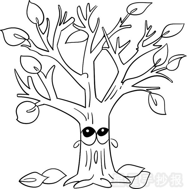 第四步,在个别树杈上画上叶子,并在地上也画上树叶,代表凋落在地上;最后,画上纹路和五官;好,会哭泣的大树我们就画好了。